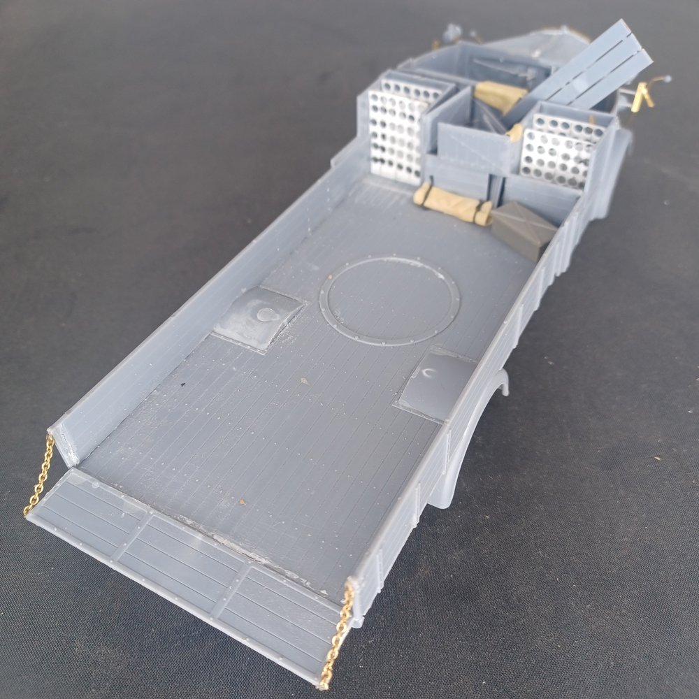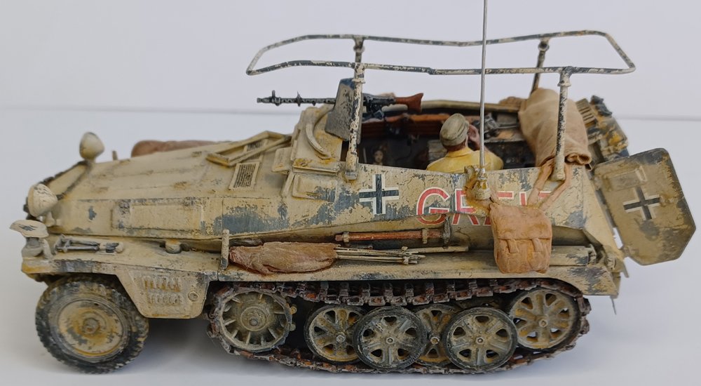 j’ai pour la première fois utilisé les filtres filtre marron foncé pour les gardes boues et passage de roues filtre bleu pour les parties métal filtre orange pour la caisse et le compartiment de combat il restera les lavis pour uniformiser tout çà puis l’empoussièrage les armes sont peintes en gun métal